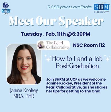 The University of Central Florida Student Chapter for the Society for Human Resource Management will warmly welcome Janine Krokey, MBA, PHR, President of the Pearl Collaborative, at their meeting on Tuesday, February 11, 2025!